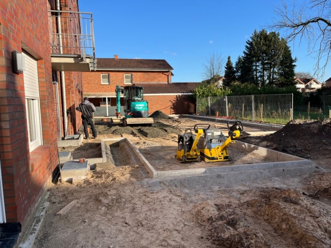 Der Karnevalsmonat Februar hält eine Menge Regen und nur wenig Sonne für die Bauarbeiten bereit. Dies hält die fleißigen Handwerker aber nicht davon ab, das neue Haus in der Vitusstraße weiter auszubauen. Im Innenbereich arbeiten Maler und Fliesenleger fleißig daran, den neuen Räumen eine neue Optik zu verpassen. Im Außenbereich wird von den Landschaftsgärtner der Garten sowie die Terrassenbereiche angelegt. Schritt für Schritt geht es nun mit riesigen Schritten voran!
