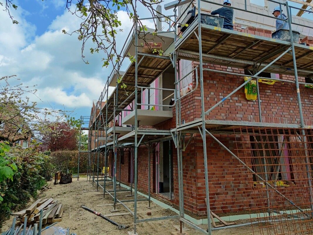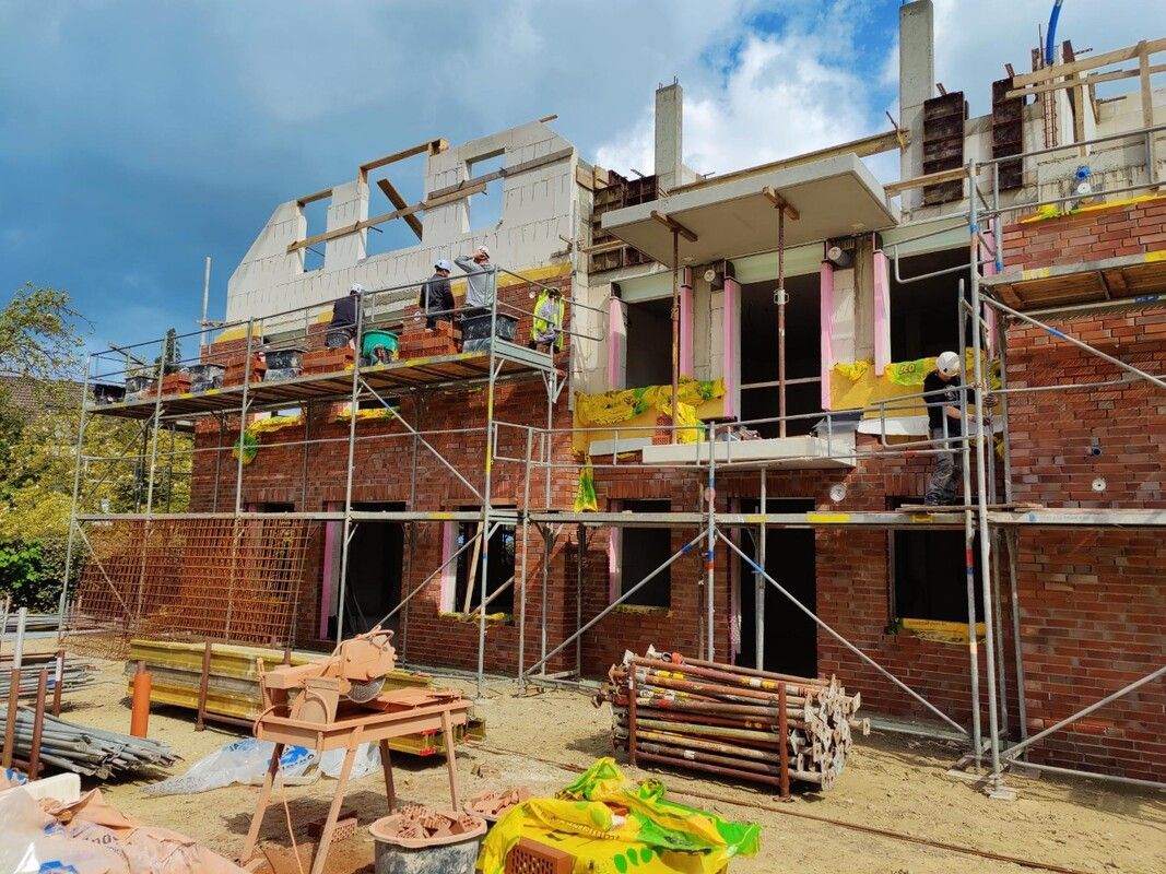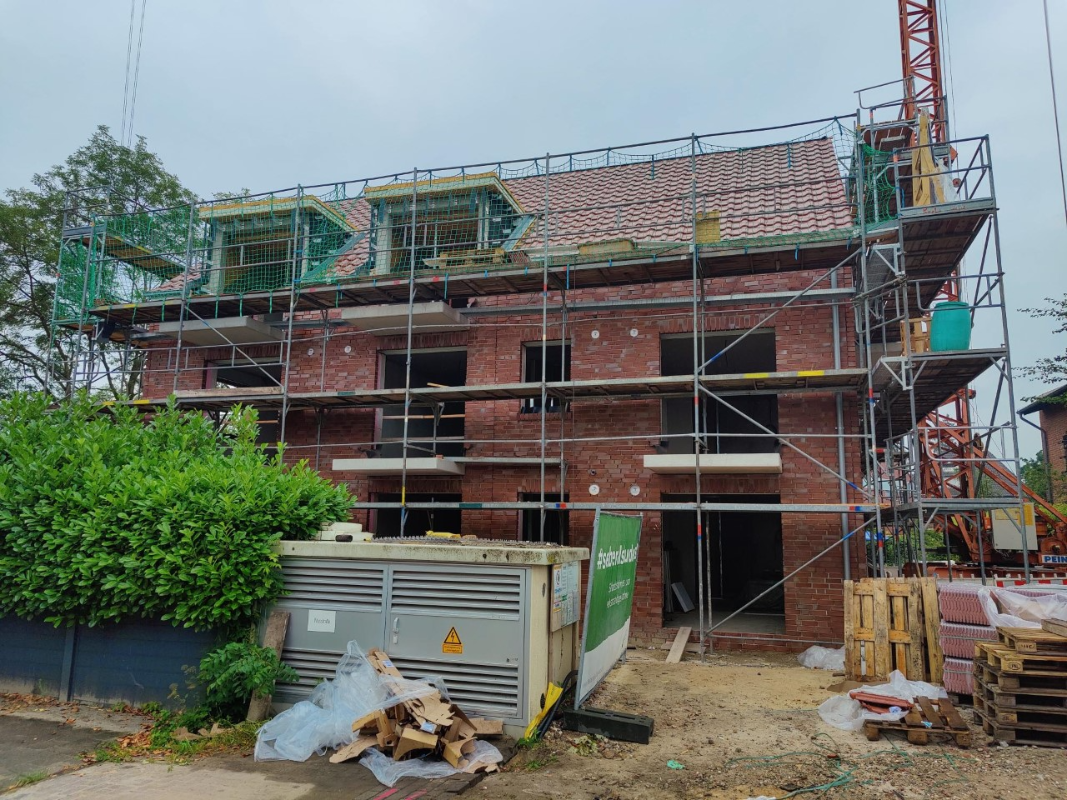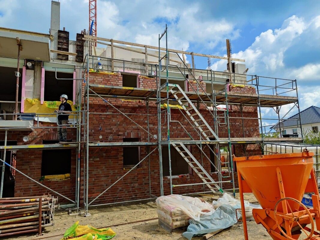 Unser Bau in der Vitusstraße nimmt weiter Formen an. Mittlerweile sind die Bauarbeiten am zweiten Obergeschoss angekommen. Auch die Klinkerarbeiten schreiten voran. Das gute Wetter begünstigt aktuell den Baufortschritt. Man kann schon erahnen, wie einige Räume später aussehen werden. Es ist jedes Mal wieder spannend zu sehen, wie ein Haus Stück für Stück wächst.